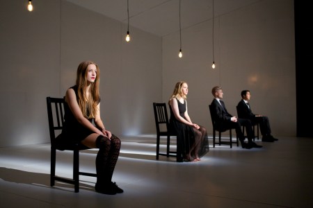 However, while the acting is superb, the most stunning – and indeed distinctive – element of ‘Crave’ is arguably its dialogue and the structure it predicates. Like the play itself, the dialogue is incredibly fragmented; the characters speak to each other primarily in pairs, with two simultaneous conversations intertwined to the extent that the four are constantly interrupting each other. Indeed, it is often difficult to grasp what exactly is going on amidst the fractured verbiage – not only is it ambiguous at times who is speaking to whom (as the dual exchanges often bleed into one another, both through theme and diction), but it becomes challenging even to follow one character’s train of thought to its conclusion. This ambiguity is further exacerbated by the lack of any conventional plot; we are never supplied with context or even a basic premise, and so must glean what we can from the convoluted dialogue. Even the nature of the characters’ relation to one another is not explicitly specified, leaving almost everything open to interpretation. Meanwhile, the language itself is poetic, but markedly plain; in fact, its power largely seems to stem from the visceral way it mimics thoughts and feelings with its fluid, unstructured nature. There’s also a wonderful musicality within the dialogue – one that emerges in full force as the short, primal syllables ricochet rhythmically off four separate lips, as the characters crescendo from soft murmurs to choked emotion, and as their troubled voices meld and detach, each a distinct melody in some elaborately orchestrated fugue. Indeed, in many ways, the play’s fragmented and lyrical nature is a chief cause of its verisimilitude, for the dissociative threads twist and interweave in a way that structurally imitates the disjointed mentality of its characters, providing a powerful and unique sensory experience.