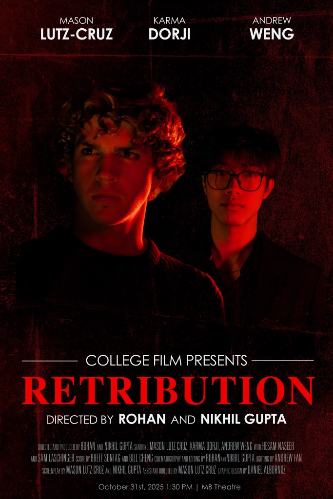 “Making retribution was definitely our biggest project yet. This past spring, my brother Rohan and I had just taken over the College Film film club. We knew we wanted to start with something big and memorable, and a murdery mystery felt like the perfect opportunity to do so