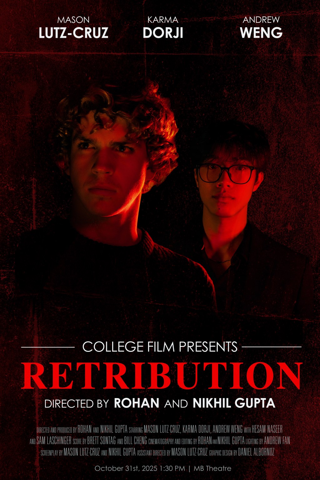 Our actors did a fantastic job in making the story come to life. Mason Lutz-Cruz, playing the lead character, Miller Chase, delivers stellar performances throughout the film. Karma Dorji and Andrew Weng both had excellent contributions. Their characters’ respective exchanges with Miller provided brilliant tension that adds an extra layer of depth to the film.