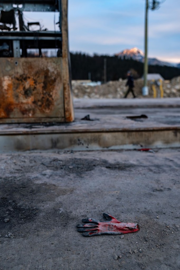 In the silent aftermath of the Jasper wildfire, a lone rubber glove lay discarded near the charred skeleton of a gas station. Behind the scene of destruction and loss, the eternal snow of Jasper’s peaks stood as an unwavering witness.