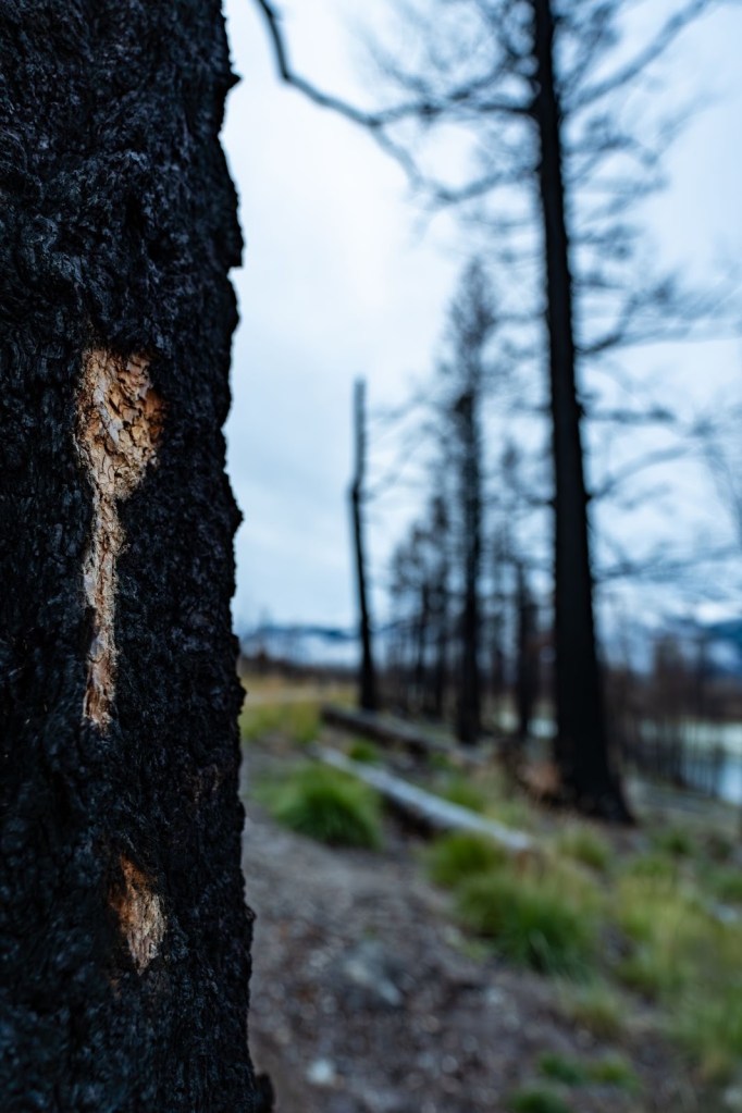 A single tree, scarred by the Jasper wildfire, stood in the foreground. Its bark, torn by its falling neighbors in the chaos, has split into the stark shape of an exclamation mark.