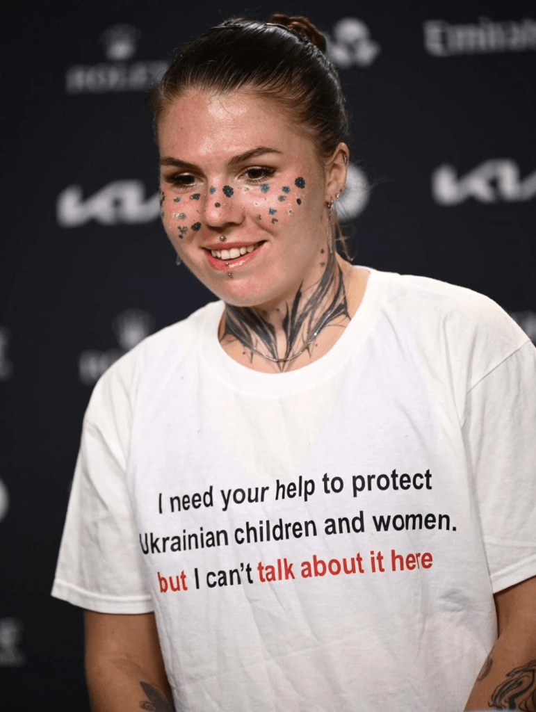 As Oleksandra Oliynykova would like to remind us with her T-shirt, the war in Ukraine is still going on. She continues to train in Ukraine with bombs flying over her head and has no coach sitting in the stands, because her father, who is her coach, is a volunteer in the Ukrainian army. Along with other Ukrainian players, she has refused to shake hands with all Russian and Belarusian players, as is usually customary in tennis. She has also accused Mirra Andreeva, Diana Shnaider, and Aryna Sabalenka of being supportive of the war and called for a ban of those players.